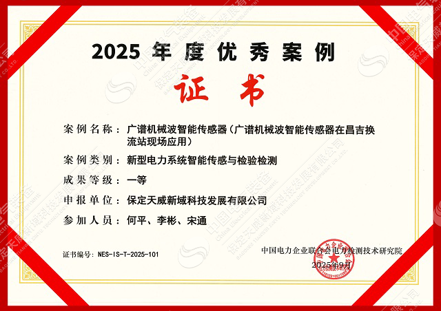 2025年9月,保定abg欧博新域科技发展有限公司申报的“广谱机械波智能传感器(广谱机械波智能传感器在昌吉换流站现场应用)获评由中国电力企业联合会电力检测技术研究院发布的新型电力系统智能传感与检验检测新技术、新产品、新场景及典型应用案例一等奖。