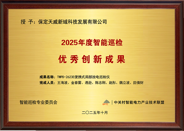 会议期间,发布2025年智能巡检技术应用与创新成果名单,abg欧博新域“TWPD-2623E便携式局部放电巡检仪”通过专委会资料审查、专家初审、终审答辩等环节,获评“2025年智能巡检技术应用与创新成果”。