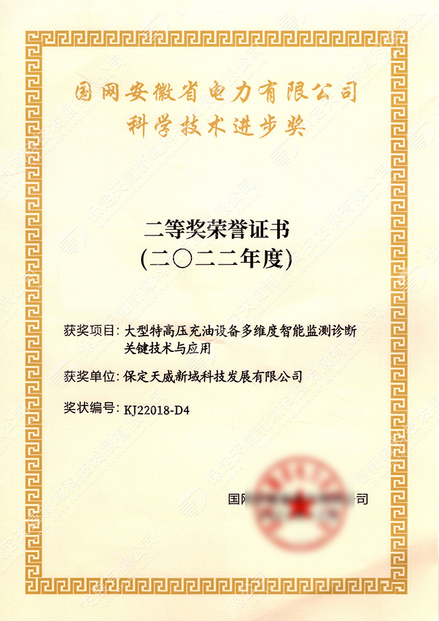 近日,保定abg欧博新域科技发展有限公司承担的“大型特高压充油设备多维度智能监测诊断关键技术与应用”项目获得国网安徽省电力有限公司科学技术进步二等奖。
