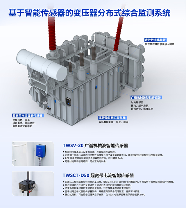 基于宽带声电传感技术的分布式变压器综合监测系统由智能网络传感单元、综合监测单元、综合监测后台三部分组成。系统可实现监测频带全覆盖,将多频段声电监测信号分别集成在一个智能传感器内,利用边缘计算技术将信号深度融合,能够根据具体设备灵活配置,大幅降低监测成本,提高监测系统维护性和可靠性,确保变压器可靠运行。