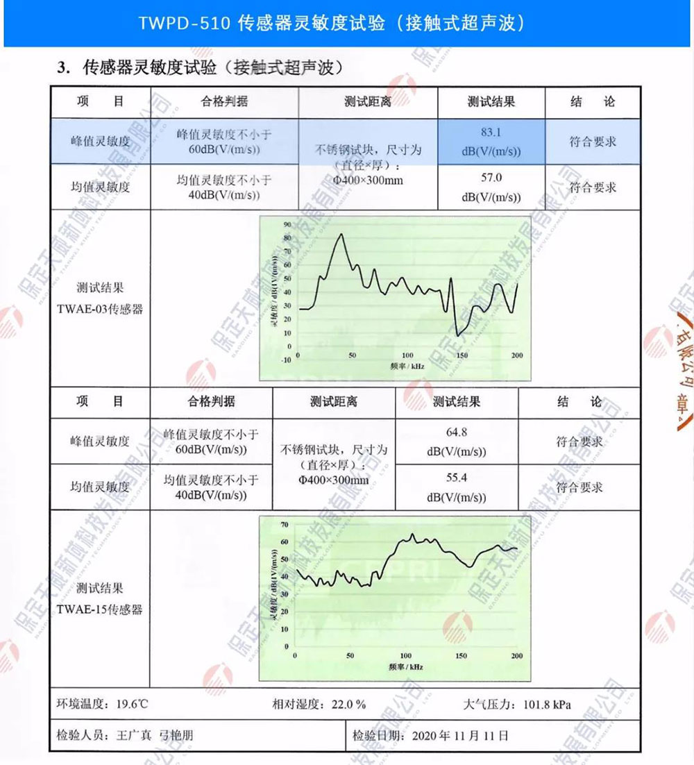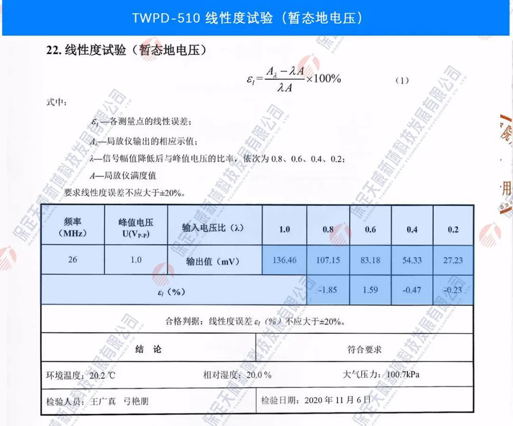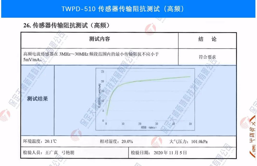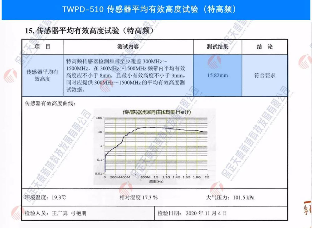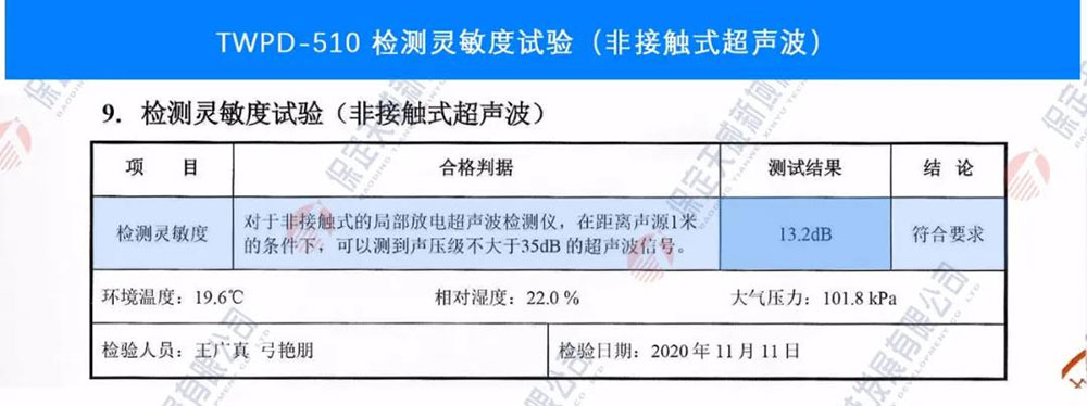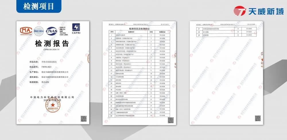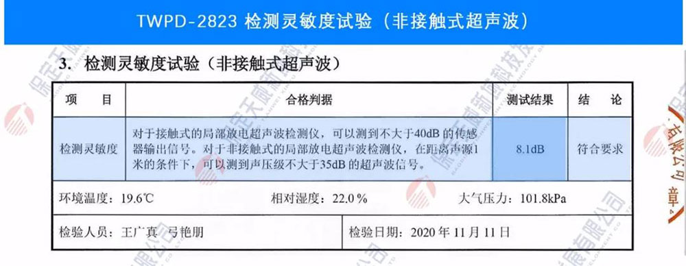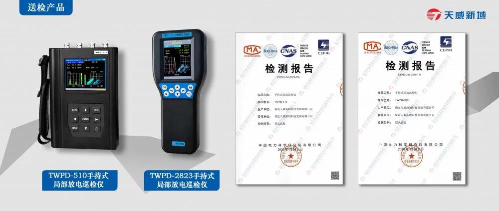 2020年公司对产品进行了进一步改进升级,已批量生产的TWPD-510手持式局部放电巡检仪、TWPD-2823手持式局部放电巡检仪,随机抽样送中国电力科学研究院进行检测和型式试验,其中TWPD-510手持式局部放电巡检仪检测项目47项、TWPD-2823手持式局部放电巡检仪检测项目29项,检测结论证明我司产品性能指标满足相关标准。